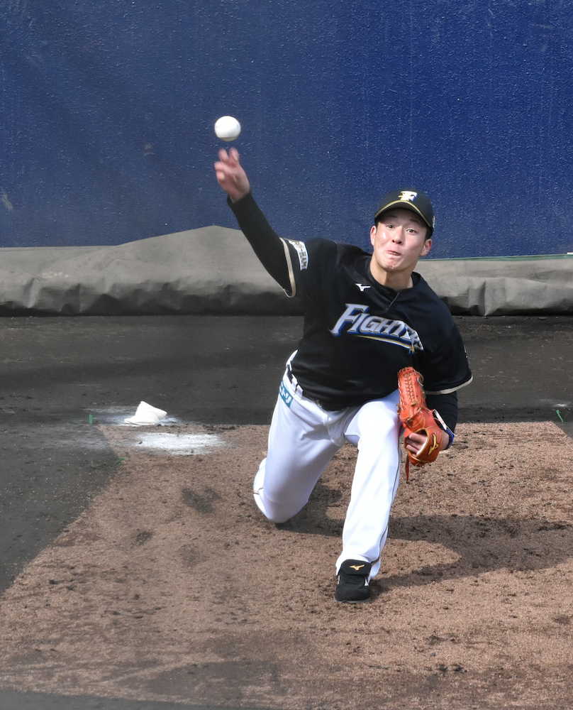 日本ハム・吉田輝 ブルペン投球でツーシーム&カーブ解禁 12日デビューへ充実の表情