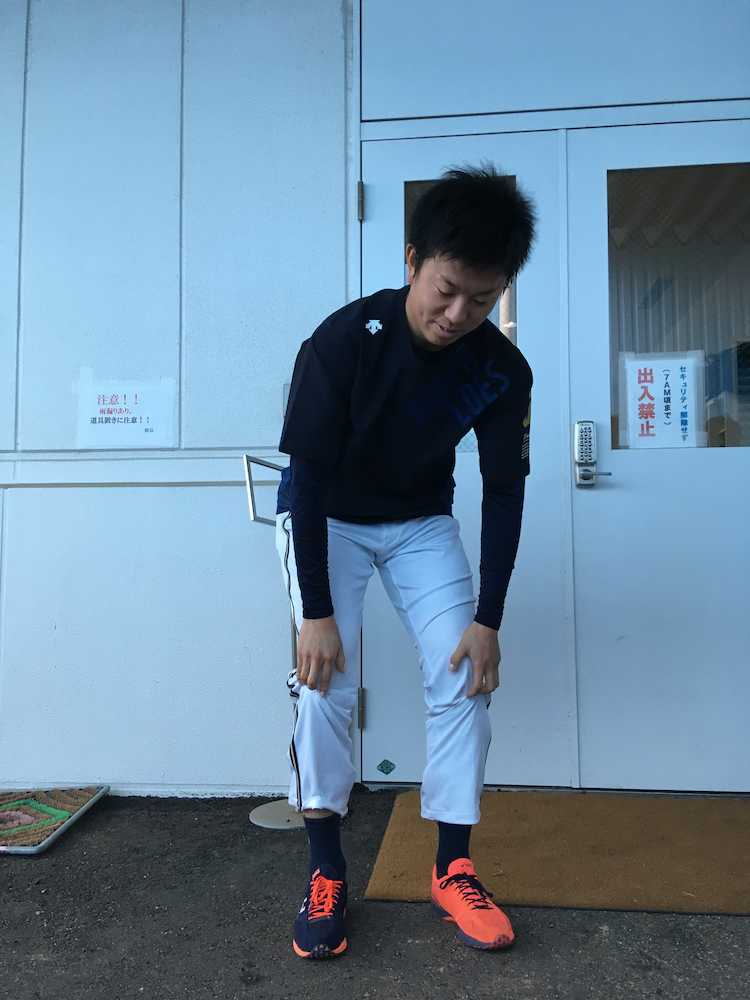 キャンプ前に届いたアップシューズは、右が紺色、左がオレンジ。アスリート特有のオシャレといえば、それまでだが、履いているのが松葉、というのが面白い。自他共に認める真面目キャラ。登板前日からピリピリムードを漂わせるほど肩に力が入るタイプだ。マウンドでは基本、仏頂面。同僚からも「肩の力を抜けよ」と言われるほど、常に気を張っている。その松葉が「不揃いのシューズ」を履いているのだから、ちょっと話題になる。写真撮影をお願いしたら、「足元だけ撮ってくださいよ」と、苦笑いでユニホームをたくし上げてくれた。