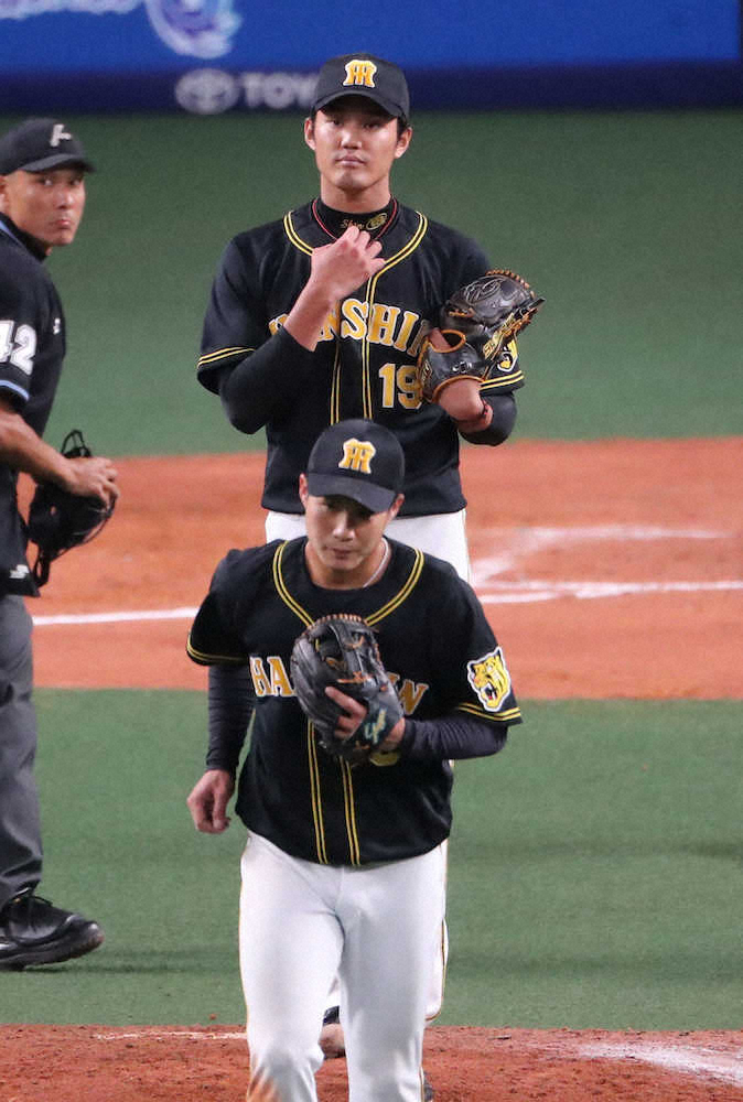<中・神>3回、ピンチでうつろな表情の藤浪。手前は木浪(撮影・成瀬 徹)