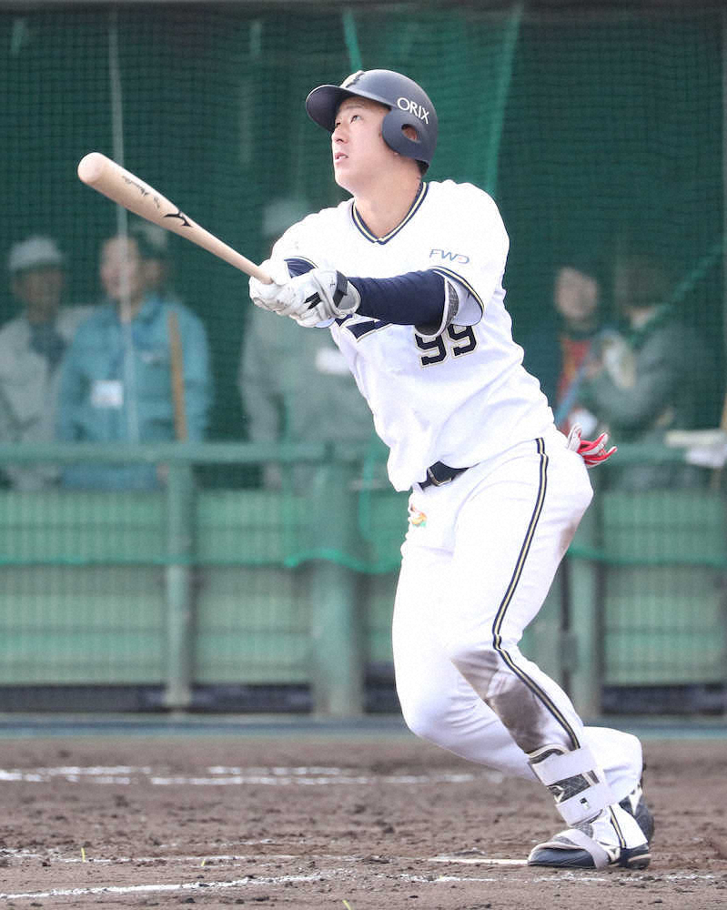 初球を逃さず、してやったりの表情。10日の日本ハム戦で宮西から1号を放っており2試合連発。今春の教育リーグでもソフトバンクの加治屋、中日・又吉から一発を放つなど勢いある男が開幕1軍争いに割って入ってきた。西村監督も「当たればホームランを打てる。チームには大きな存在になりつつある」と頼もしげに見つめた。