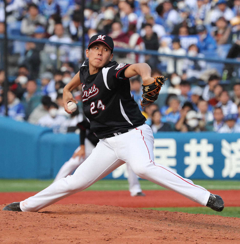 7回から3番手で登板した東妻は、最速150キロを計測した直球を主体にわずか9球で1回無安打無失点。「コーナーに集めることができたし、少しずつ、プロのマウンドにも慣れてきました」と笑顔。日体大の先輩で「幕張の防波堤」と呼ばれた小林雅英氏が、解説を務める前での快投だった。