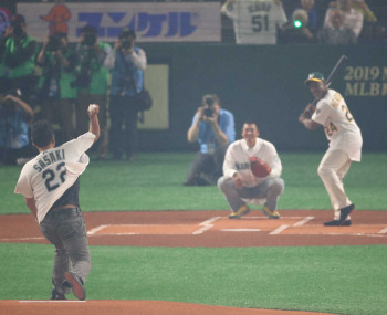 始球式はマリナーズOB、00~03年所属の佐々木主浩氏(51)と06~09年所属の城島健司氏(42)がバッテリーを組んだ。打席にはアスレチックスOBで歴代1位の1406盗塁を誇るリッキー・ヘンダーソン氏(60)。
