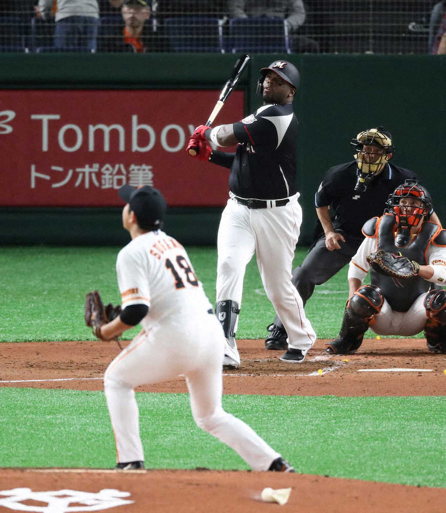 最初の衝撃は2回だ。菅野の初球スライダーを捉えた打球は東京ドームの右翼席上部の「ヘーベルハウス」の看板を直撃。日本球界のエースから打ったバルガスは怪力を誇示するように両手で両胸を叩くゴリラポーズで喜びを爆発させた。