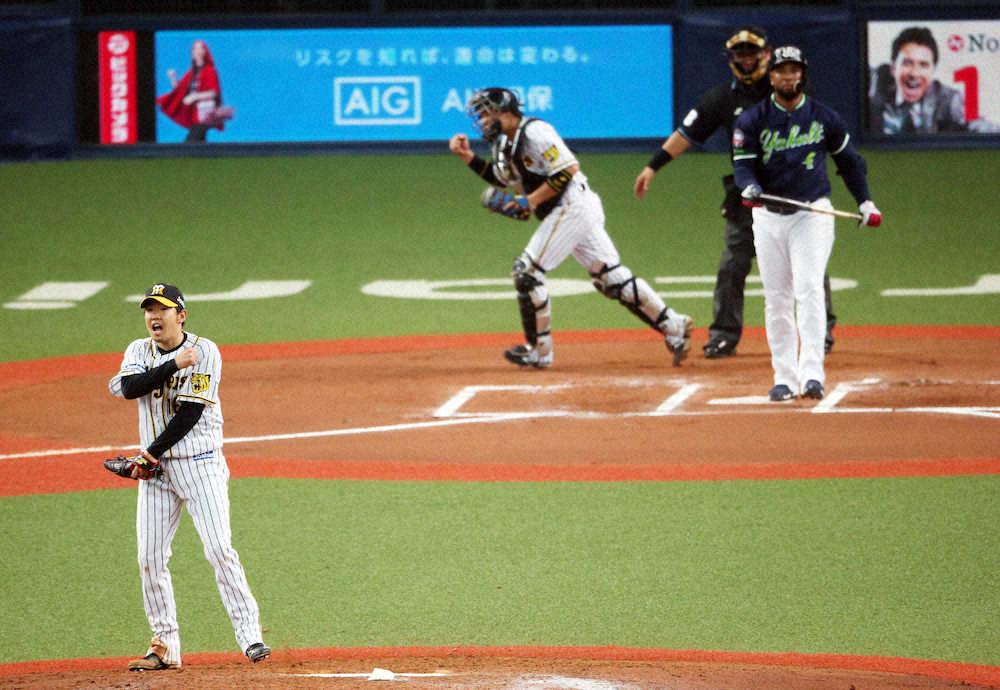 <神・ヤ>6回2死一塁、打ち直しの打席でバレンティンを空振り三振に仕留めてガッツポーズの西(撮影・北條 貴史)