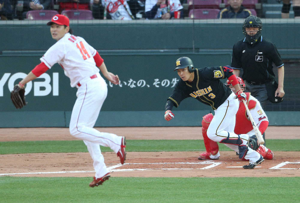 初回、16年6月26日以来の「1番・遊撃」でスタメン出場した鳥谷の中前打で作った2死二塁の好機で、追い込まれながら大瀬良のカットボールを捉えて中前適時打。試合前まで打率1割を切るなど不振に苦しんでいた若虎が得点圏10打席目で初安打を放った。