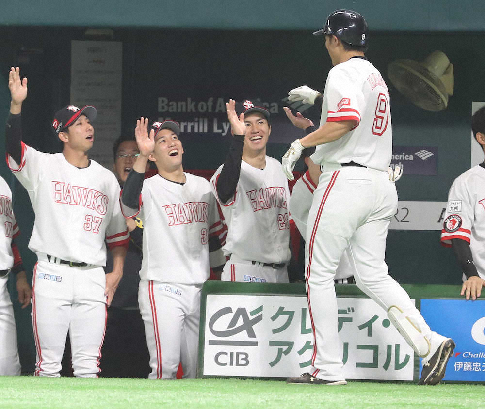 <ソ・ロ3>初回1死一塁、2ランを放った柳田を出迎える高橋礼(左から3人目)ら(撮影・岡田 丈靖)