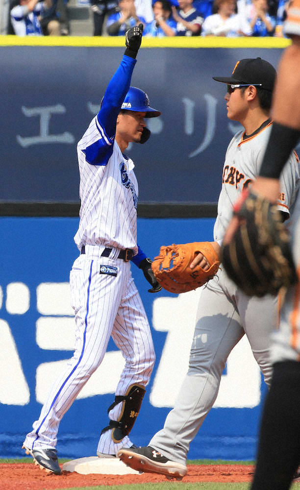 <D・巨(2)>2回2死一、二塁大和は先制タイムリー二塁打を放ちガッツポーズ(撮影・森沢裕)