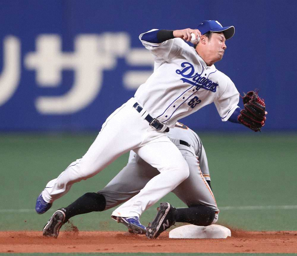 6回1死一塁。打者・小林が放った打球を遊撃手・京田が捕球し、二塁ベースカバーに入った堂上に転送。まず2アウト目を奪った。堂上はすぐさま一塁へ転送し、併殺プレーを完成させようとしたが、一塁走者・ビヤヌエバのスライディングを足に受け転倒し、投げることができなかった。