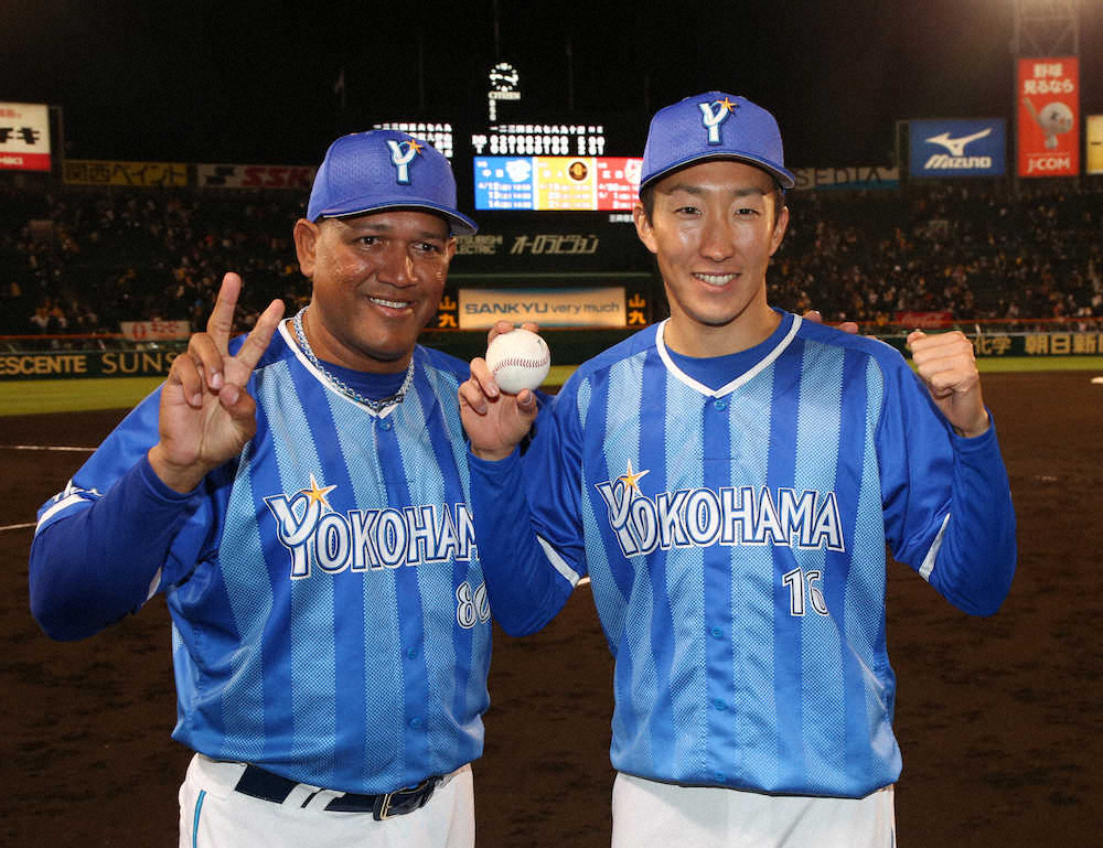 プロ初勝利を挙げた大貫はウイニングボールを手にラミレス監督と記念撮影(撮影・大森 寛明)
