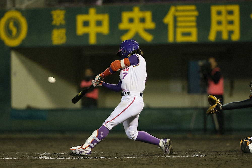 4回までに4点のビハインドを背負った京都は、5回に反撃開始。先頭の佐々木が右前打で出塁したのを皮切りに打者一巡の猛攻で、この回一挙4得点。試合を振り出しに戻すと、6回には村松がこの試合3本目の安打となる左中間2点適時打を放ち、勝ち越した。「チームメートがつないでくれたおかげで打つことができました」。ヒロインの声が古都の夜空に響いた。