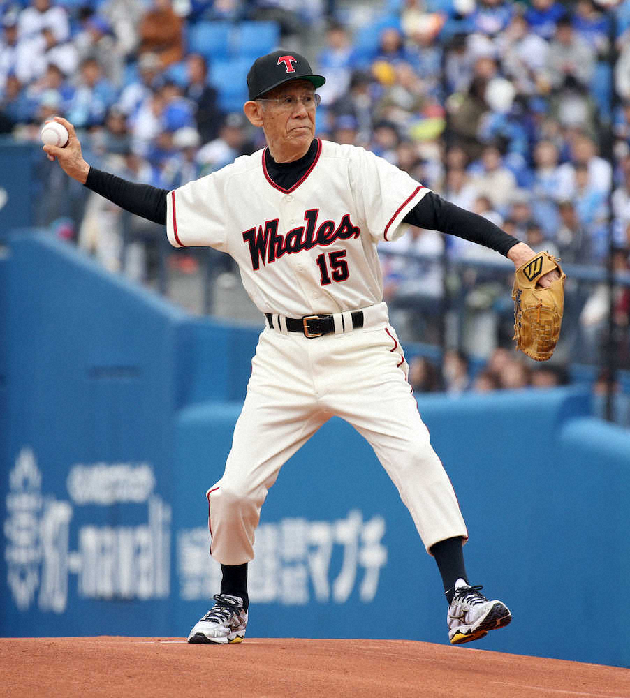 球団創設70年記念試合の第2戦となった広島戦で、球団OBの稲川誠氏(82)が始球式を行った。