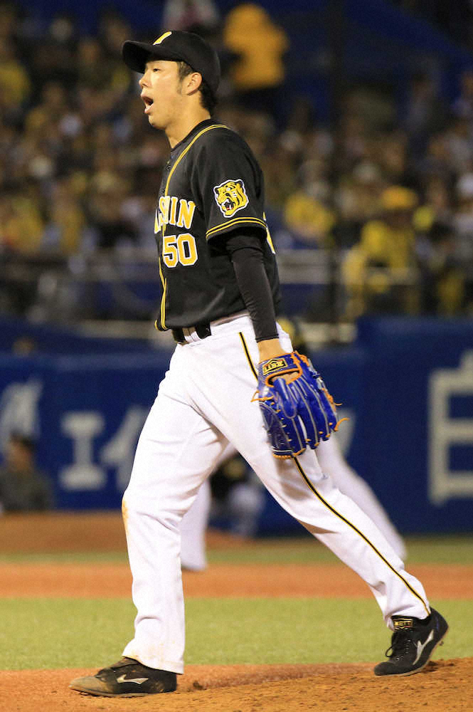 <ヤ・神>6回2死雄平を三振に打ち取り吠える青柳(撮影・森沢裕)