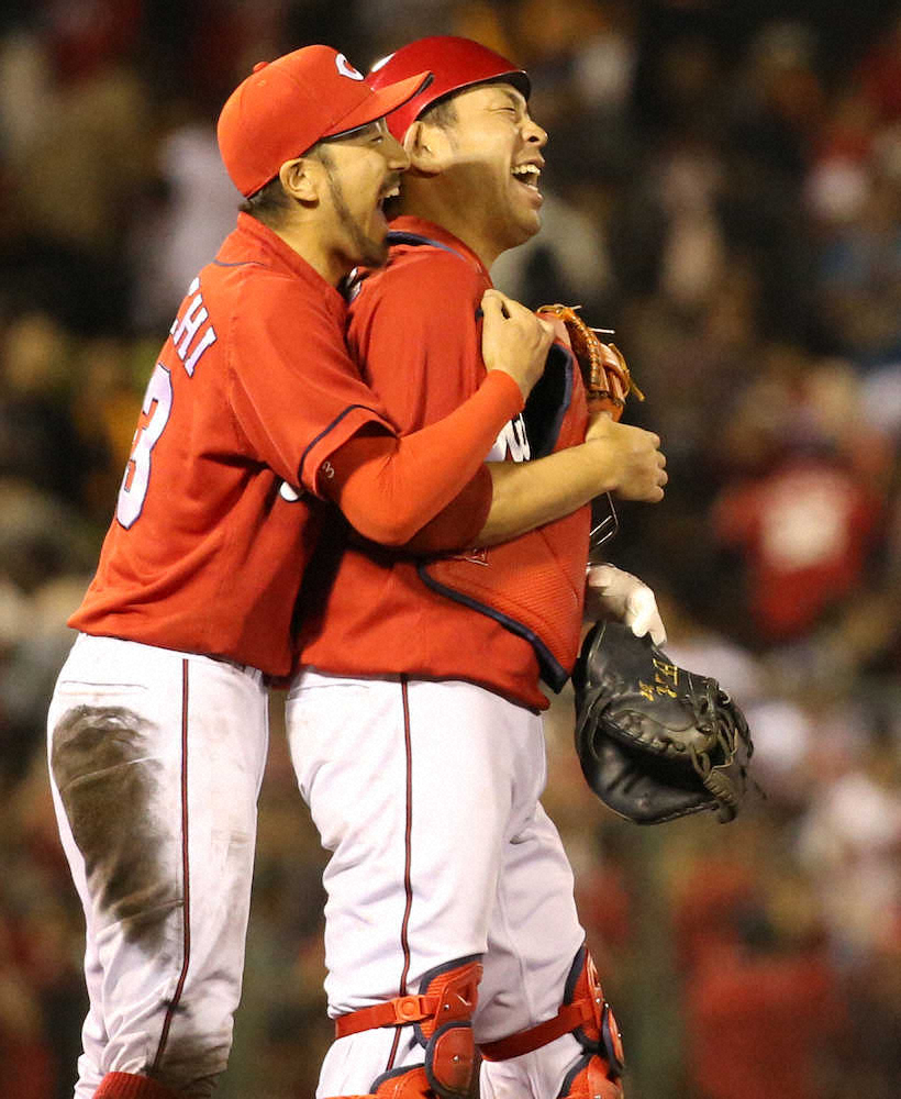 <巨・広>巨人に勝利し笑顔を見せる石原(右)と菊池(撮影・西尾 大助)