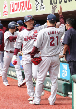 <楽・オ>2回2死一塁、レフトへソロ本塁打を放った嶋は釜田(右)と喜ぶ(撮影・西海健太郎) Photo by スポニチ 楽天・釜田 右肩&右肘手術乗り越え655日ぶり復活白星!6回途中3失点 打… ギャラリーで見る この記事のフォト 2019年04月21日の画像一覧 もっと見る 2019年04月21日の画像をもっと見る