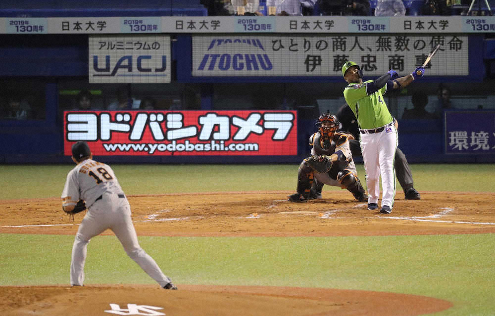 <ヤ・巨>3回無死一塁、菅野(左)から先制の2点本塁打を放つ青木(撮影・木村 揚輔) Photo by スポニチ ヤクルト青木、山田、バレンティン 巨人・菅野から3者連続本塁打! ギャラリーで見る この記事のフォト 2019年04月25日の画像一覧 もっと見る 2019年04月25日の画像をもっと見る