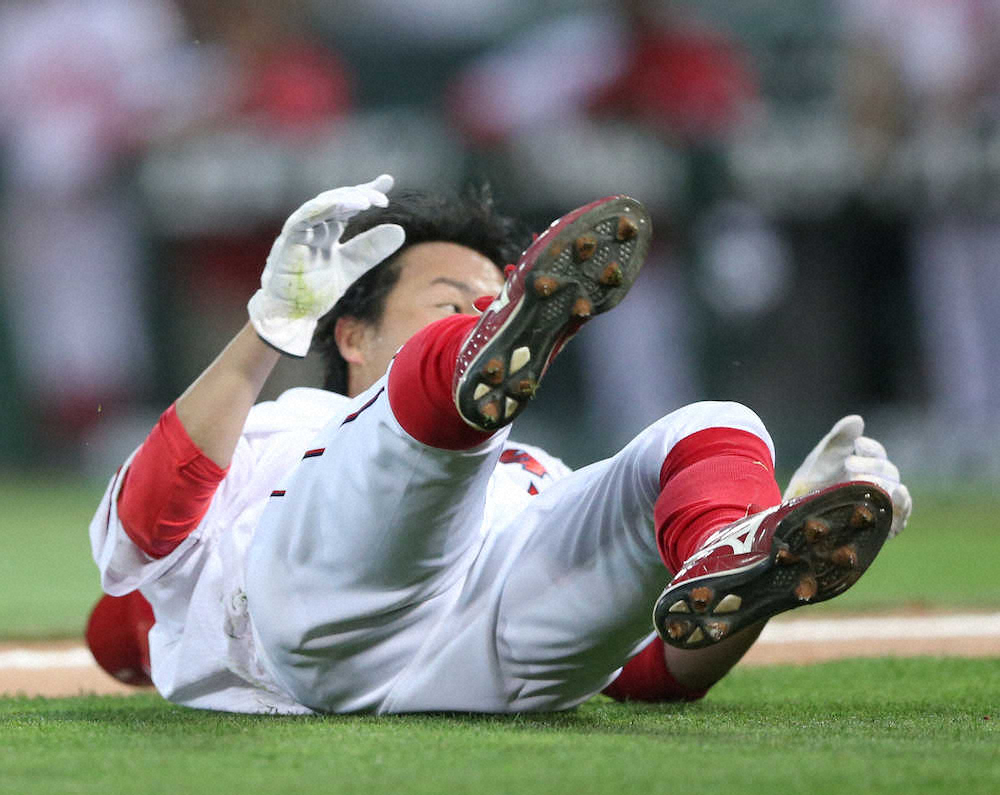 <広・中>4回1死一塁、三本間で転倒してタッチアウトとなる長野。捕手加藤(撮影・北條 貴史) Photo by スポニチ 広島、長野まさかの転倒 本塁目前で足もつれ…絶好の先制機逃す ギャラリーで見る この記事のフォト 2019年04月25日の画像一覧 もっと見る 2019年04月25日の画像をもっと見る