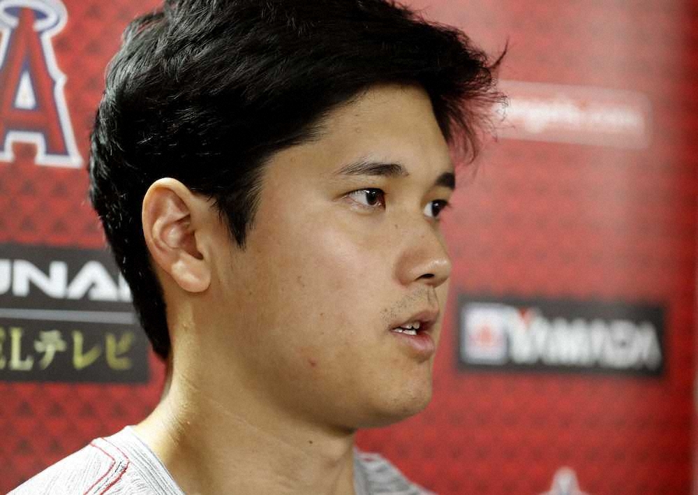 打撃練習を終え、取材に応じるエンゼルス・大谷