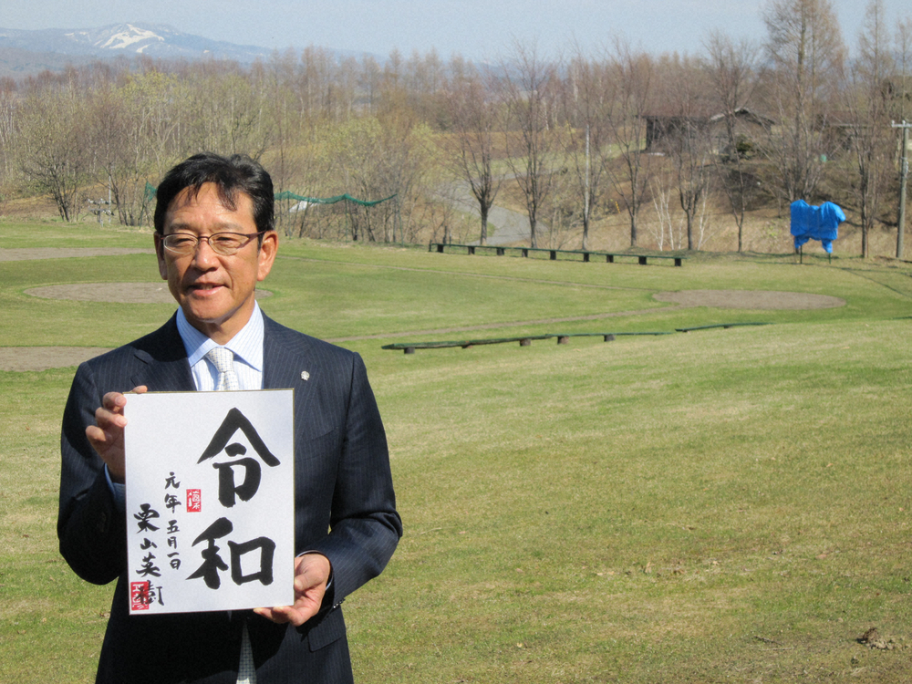 天然芝の野球場をバックに「令和」の色紙を持つ栗山監督