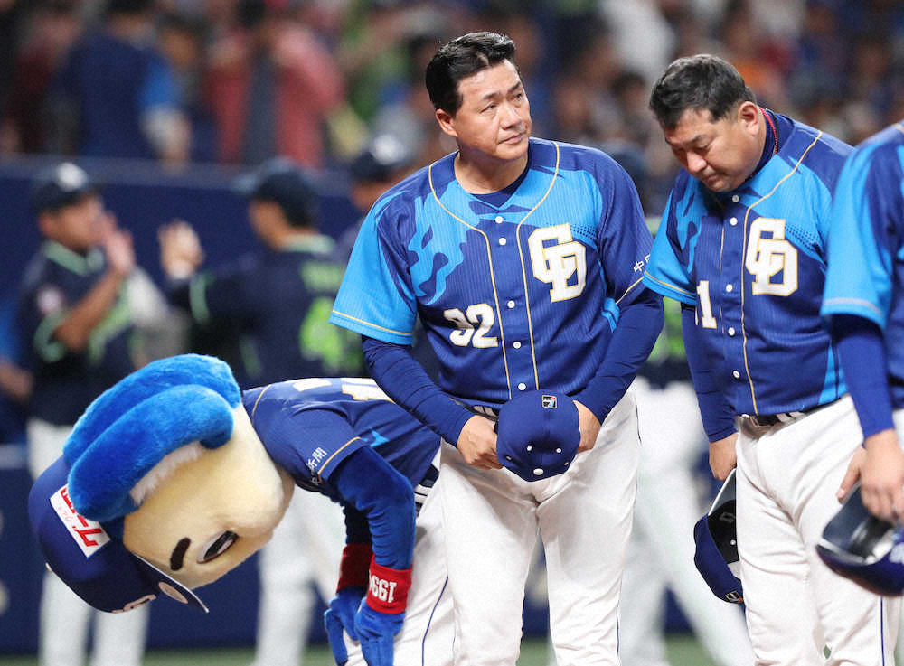 <中・ヤ>ヤクルトに敗れ3連敗となり、ガックリとスタンドに頭を下げる与田監督(中)(撮影・椎名 航)