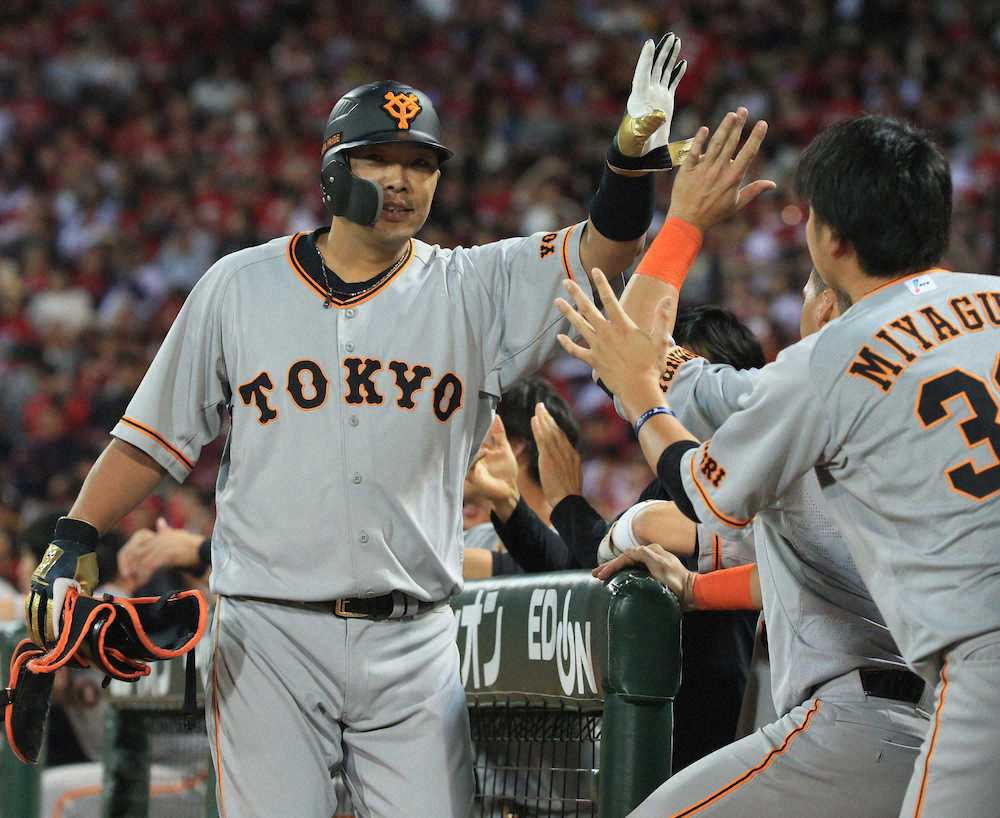 <広・巨>7回、代打・阿部はタイムリーを放ちナインの出迎えを受ける(撮影・森沢裕)