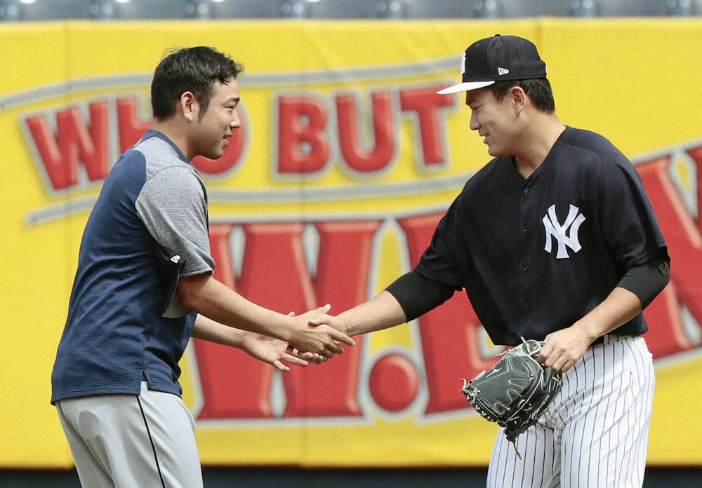 投球練習前にはマ軍・菊池と談笑。「“いい感じやね、頑張ってね”と言いました」とほぼ面識はなかったというが、笑顔だった。(ニューヨーク・杉浦大介通信員)