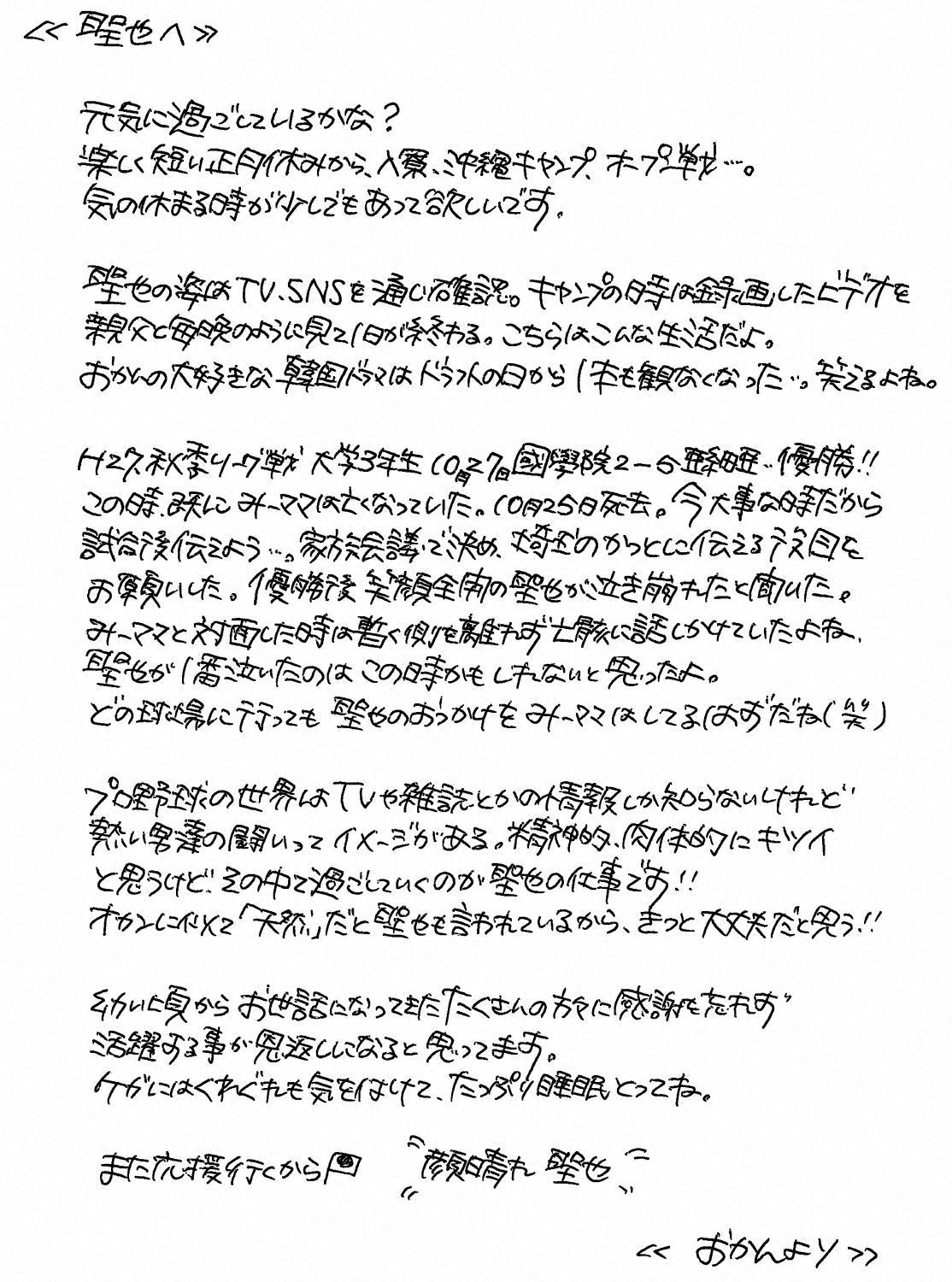 開幕前に母が書いた激励の手紙。特に心配されたのが体調面だ。社会人とプロでは試合数が全く違う。睡眠時間はしっかり取れているだろうか。そんな不安をよそに毎試合全力を振り絞っていた。ベンチでは最前列で声を張り上げ、投手が窮地の時には歩み寄って一声かける。今回の12連戦ではさすがに「疲れがたまる」と漏らしたが、勝負どころで力を発揮した。