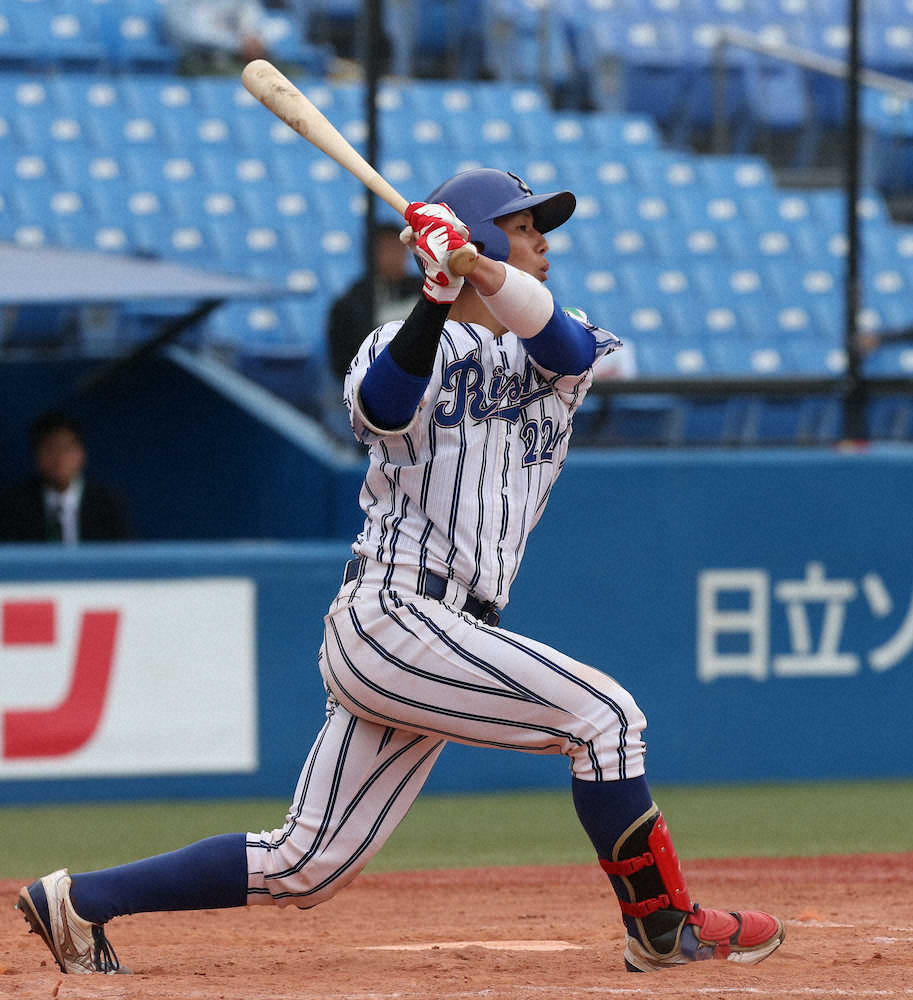 「恐怖の8番」立松由宇捕手(3年、藤代)の“読み”が奇跡のリーグ連覇へ望みをつないだ。2―2の延長11回2死一、二塁、カウント0―2から左前タイムリー。開幕5連敗で迎えた3日・中大戦の満塁弾に続き2戦連続の決勝打だ。