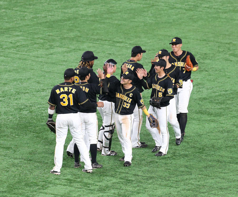 <巨・神>巨人に勝利し笑顔を見せる糸原ら(撮影・西尾 大助)
