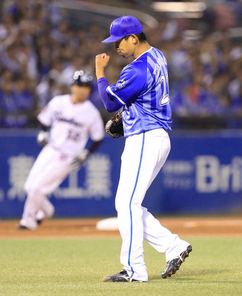 5回2死二塁 青木を打ち取りガッツポーズする今永 (撮影・白鳥 佳樹)