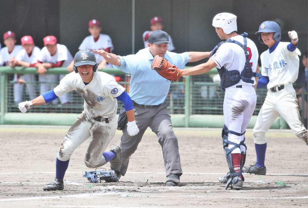 昨夏の甲子園の準々決勝、金足農―近江の激戦を再現をしているかのようだった。5―1で迎えた6回1死満塁、3番・諏訪凱(3年)に打席が回ってきた。一打で大量得点が見込めたが、三塁へスクイズを試み、成功させた。捕球した三塁手が一塁へ送球すると、二塁走者の山口万葉(3年)が三塁ベースを蹴り、本塁へ突っ込んだ。