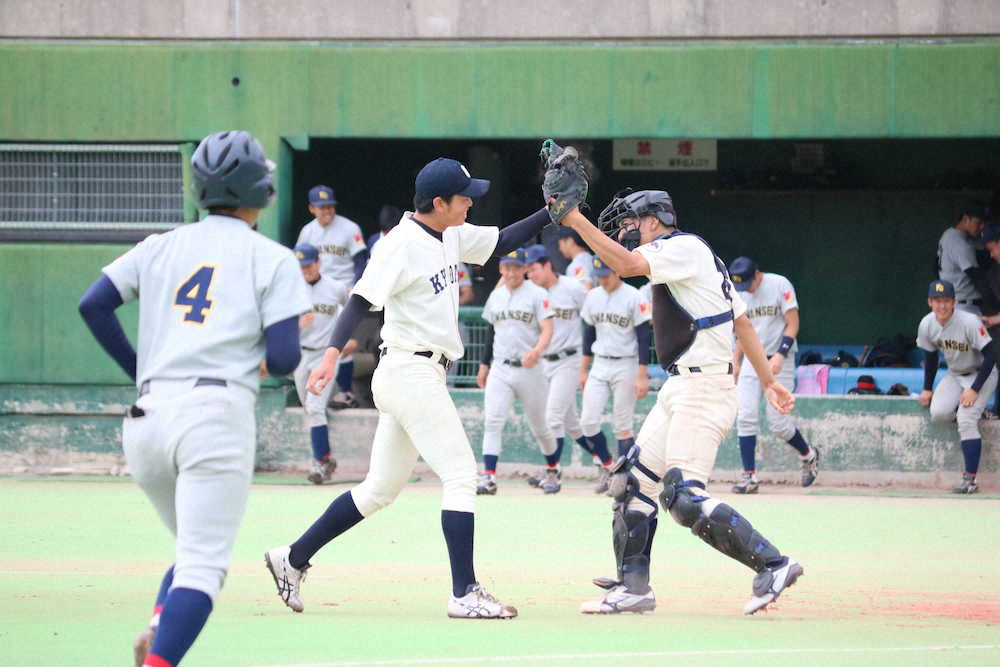 総力で勝ち切った。初回に先制点を失ったが、2回2死二塁、中村海斗外野手(4年=天王寺)が右翼線に同点二塁打。1―2の3回1死一塁では4番・脇悠大内野手(2年=膳所)が右翼線に同点二塁打を放った。同点の4回には相手失策、スクイズ、主将の西拓樹内野手(4年=西京)の左前打で一挙3得点。中盤までに築いたリードを4投手の継投で守り切った。7回から3番手として登板し、3回2安打無失点と好リリーフした投手代表の長谷川は「(エースの)藤原頼みでしたが、やっと他の投手で勝つことができました」と胸を張った。