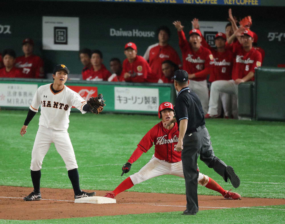 <巨・広>4回1死一、二塁、一度はセーフになるも勢いで飛び出し、その間に弟・田中俊太(中央左)にタッチされ、アウト判定を下される二走・田中広輔(撮影・木村 揚輔) Photo by スポニチ 広島VS巨人 首位攻防第2Rで“田中兄弟”絡むリプレー検証 兄の足が先か弟… ギャラリーで見る この記事のフォト 2019年05月25日の画像一覧 もっと見る 2019年05月25日の画像をもっと見る