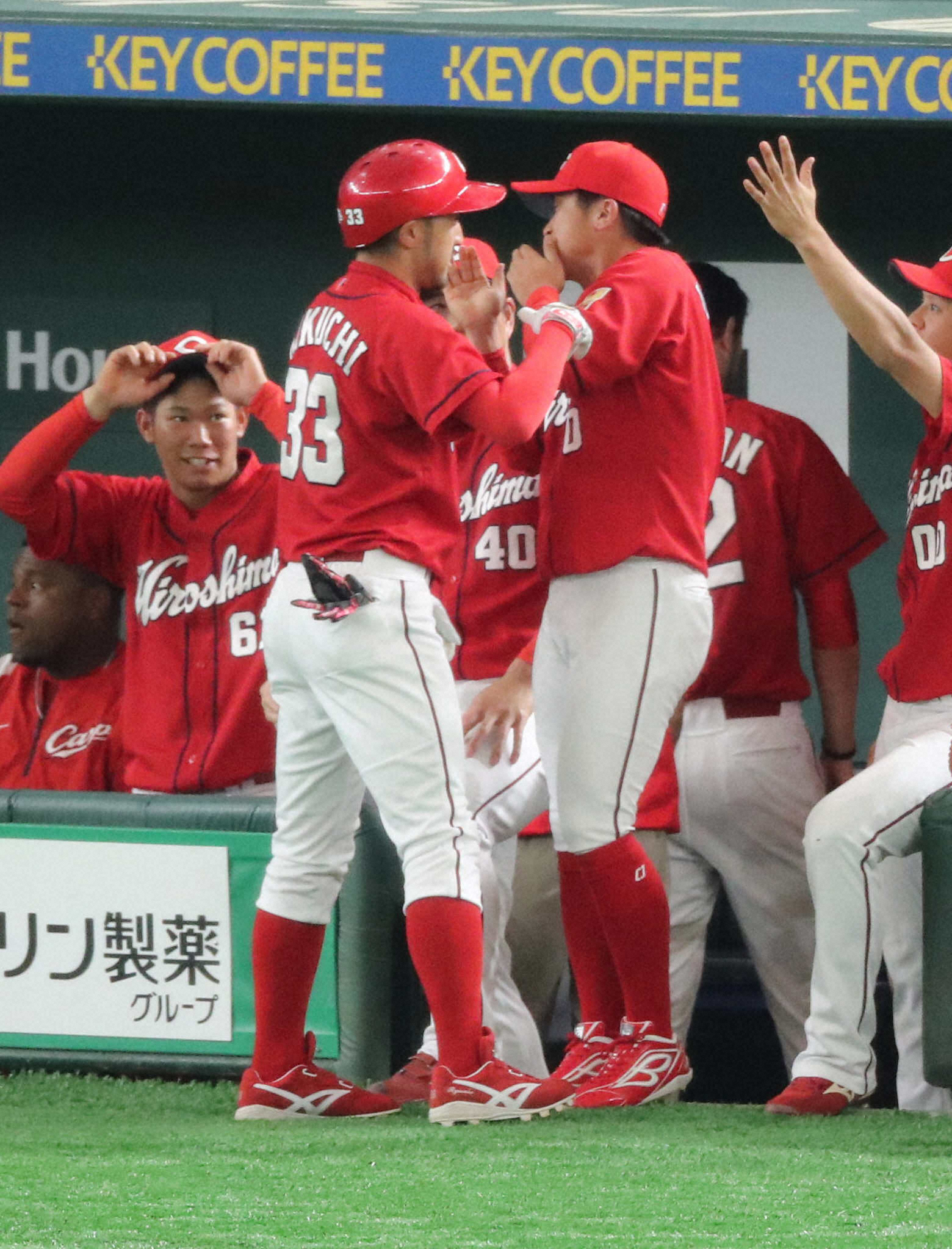 ソロ本塁打を放った菊池涼(左)を変な顔で迎える上本(撮影・木村 揚輔)