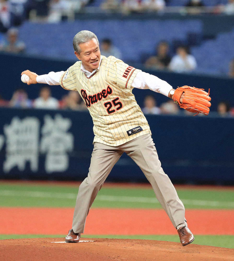 山田久志氏 復刻ユニでサブマリン始球式「届いてよかった」と笑顔