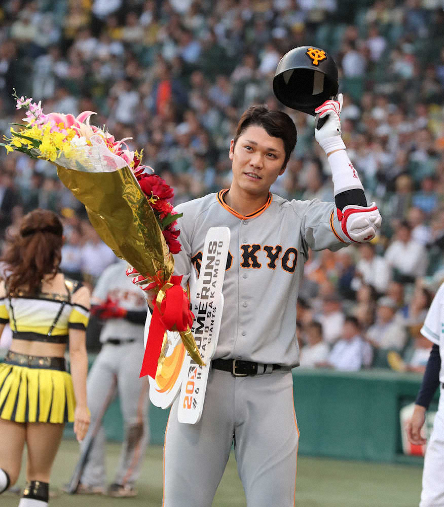 <神・巨>3回2死、通算200号本塁打を放ち、花束と記念のボードを受け取る坂本勇(撮影・大森 寛明)