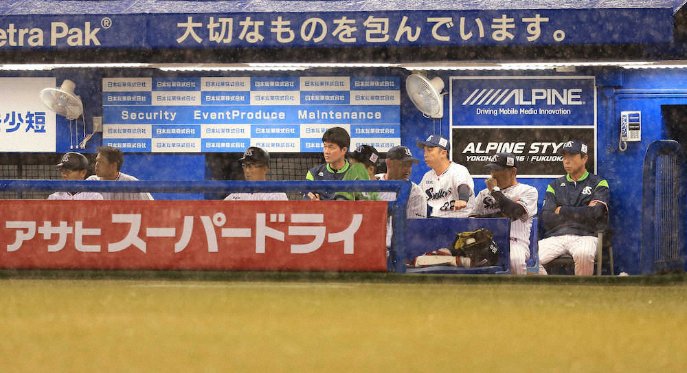 <ヤ・広>5回1死一、三塁の場面で雨のため中断。再開を待つヤクルトベンチ(撮影・篠原岳夫)
