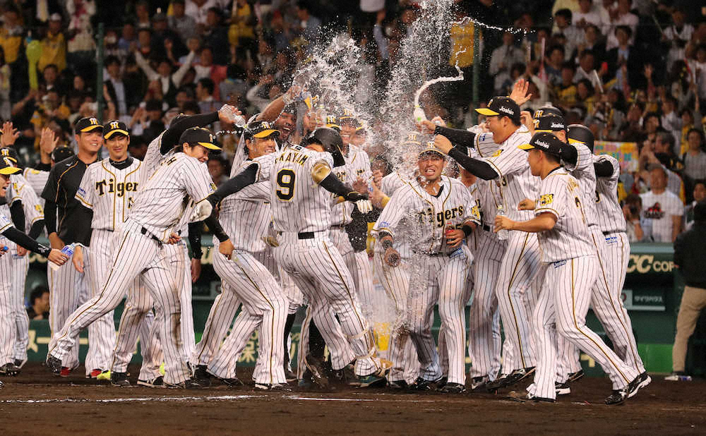 4―4で迎えた延長12回1死満塁。ベンチに残る最後の野手として代打で登場すると、左腕・池田の2ボールからの高めスライダーを仕留めた。ホームベース付近で待つナインを見つけると速度を上げて駆け込んだ。手荒い祝福でびしょぬれになった後、飛び出してきていた矢野監督と熱い抱擁。「水の勢いが強すぎて耳に水が入って抜けていない。でも、本当にうれしい」。いつもは冷静な男が、無邪気な笑顔で喜びを爆発させた。