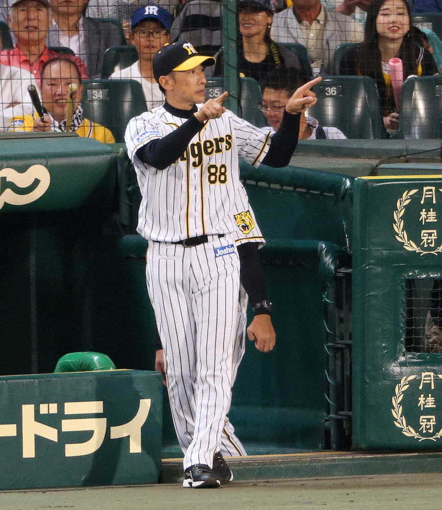 <神・巨>4回2死一、二塁、糸原の二ゴロの判定を巡ってリクエストを要求する矢野監督(撮影・北條 貴史)