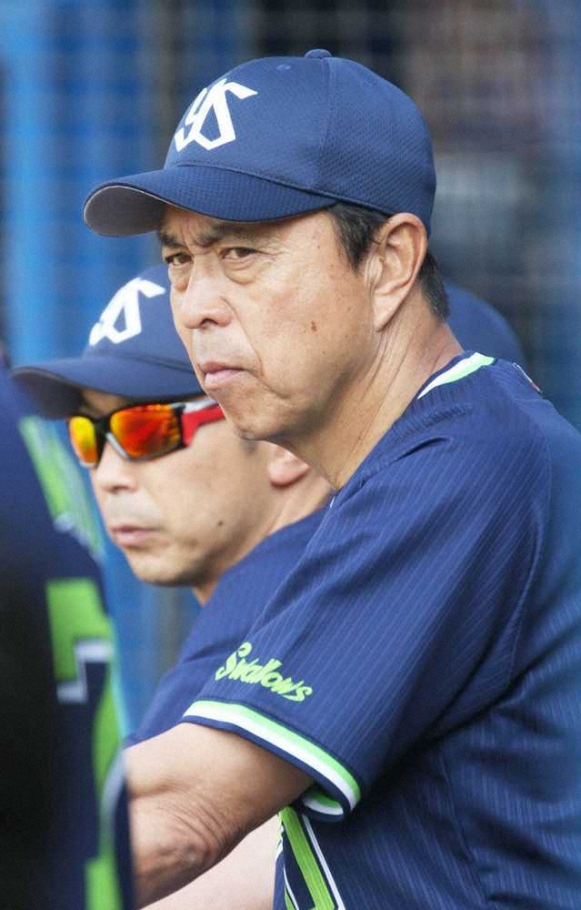 <D・ヤ11>5回無死一、三塁、見逃し三振の代打・雄平(左)とベンチの(右から)小川監督、宮本ヘッドコーチ(撮影・村上 大輔)