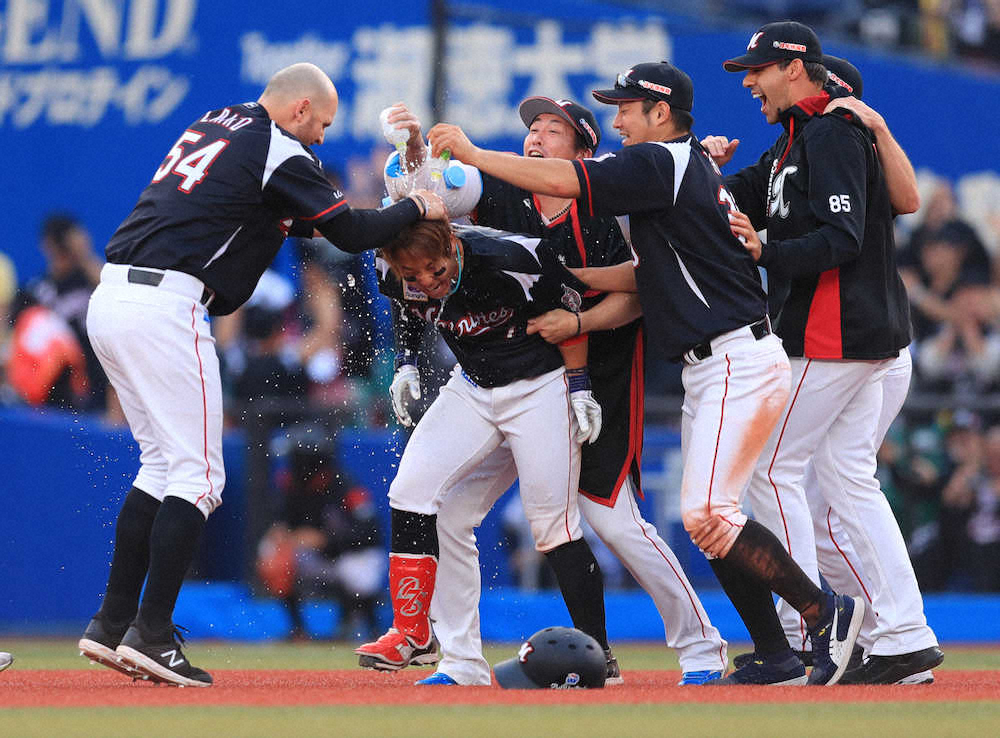 <ロ・西>10回2死一、二塁 サヨナラ適時打を放ち手荒い祝福を受ける鈴木大地 (撮影・白鳥 佳樹)