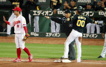 そしてサヨナラのシーン。劇的な一打を放ち、もみくちゃになる野間の向こうでもう一つ歓喜の輪が…。サヨナラのホームを踏んだ上本のもとに一目散に向かったのは長野&菊池涼。2人でタカシのユニホームを脱がそうといたずらっぽい表情を見せます。タカシはその後も集まってきたナインに次々と頭を叩かれ、最後は野間とハイタッチ。ムードメーカー2人の活躍にナインの笑顔があふれました。