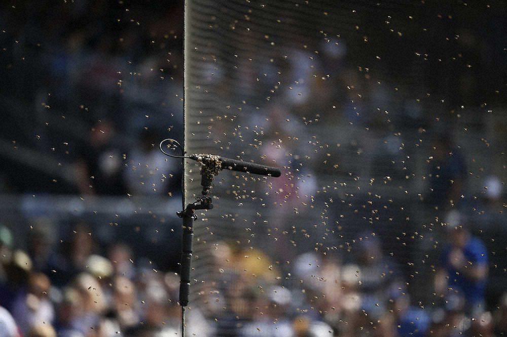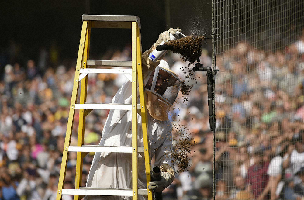 カリフォルニア州サンディエゴのペトコパークで2日に行われたパドレス対マーリンズ戦が3回に一時中断。バックネットに設置してあった集音マイクにハチが群れ始めたためで、担当の作業員が掃除機にハチを吸い込んで駆除するまで28分間にわたって試合進行がストップした。