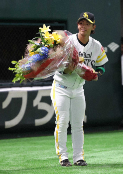 <ソ・中>通算1000試合を達成し花束を受け取る今宮(撮影・岡田 丈靖)