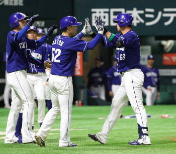 <ソ・中>6回1死満塁、満塁本塁打を放った代打・堂上(右)をナインとハイタッチ(撮影・岡田 丈靖)