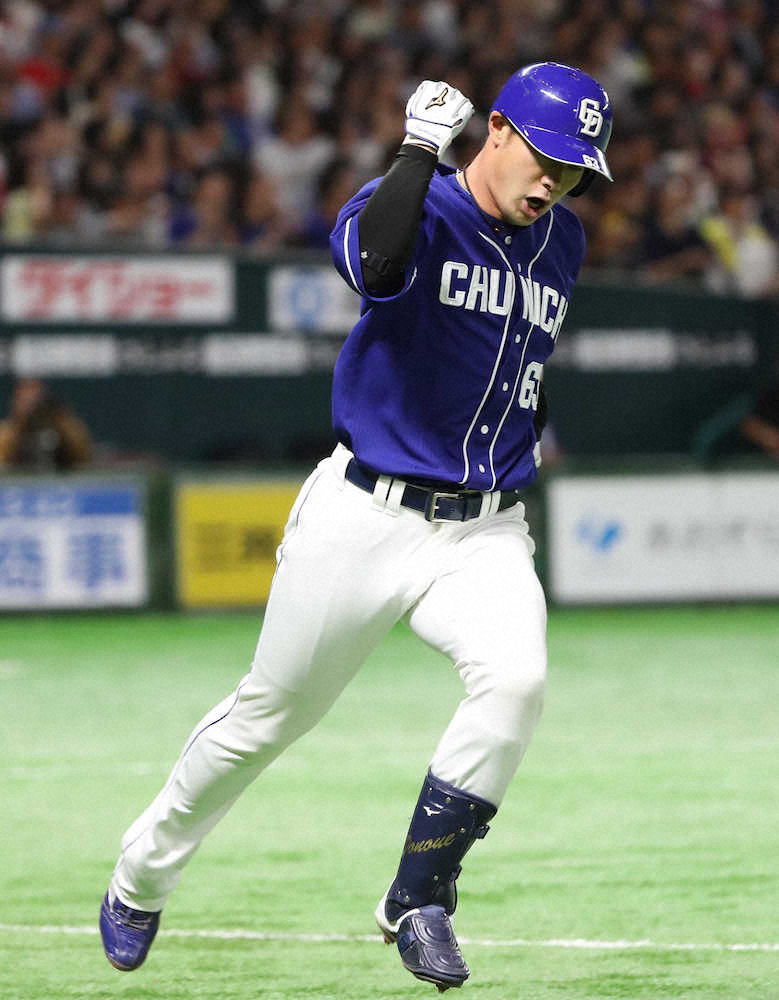 <ソ・中>6回1死満塁、満塁本塁打を放った代打・堂上はガッツポーズ(撮影・岡田 丈靖)