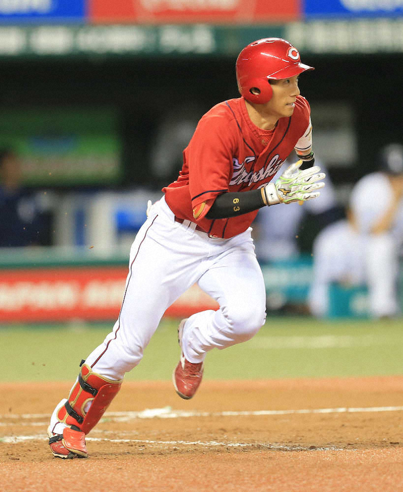 広島・西川 ラスト5打席目で内野安打放ち、27試合連続安打達成 誠也9球粘って四球、打順回す