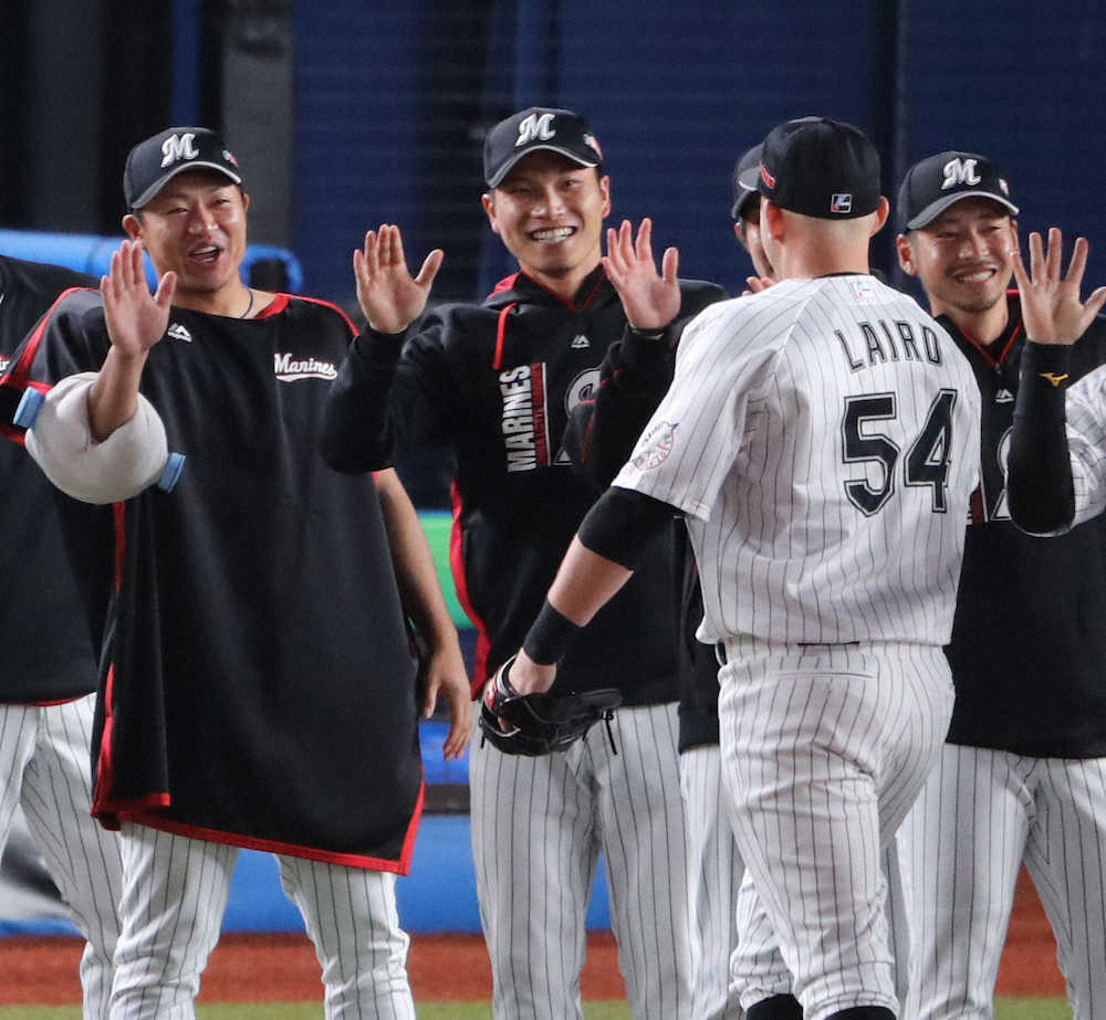<ロ・神>笑顔でナインとハイタッチをかわす岩下(左から2人目)(撮影・大森 寛明)