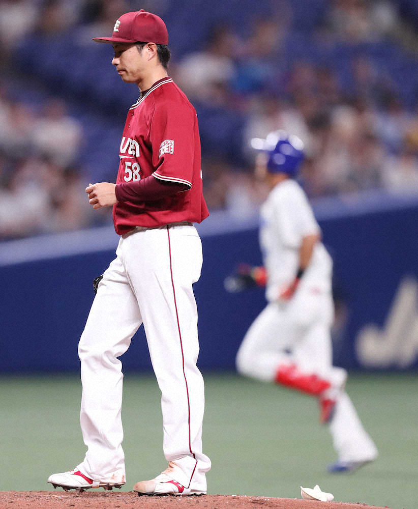 <中・楽>2回表1死一、三塁、藤井(右)に左越え3ランホームランを打たれ、ガックリの辛島(撮影・椎名 航)
