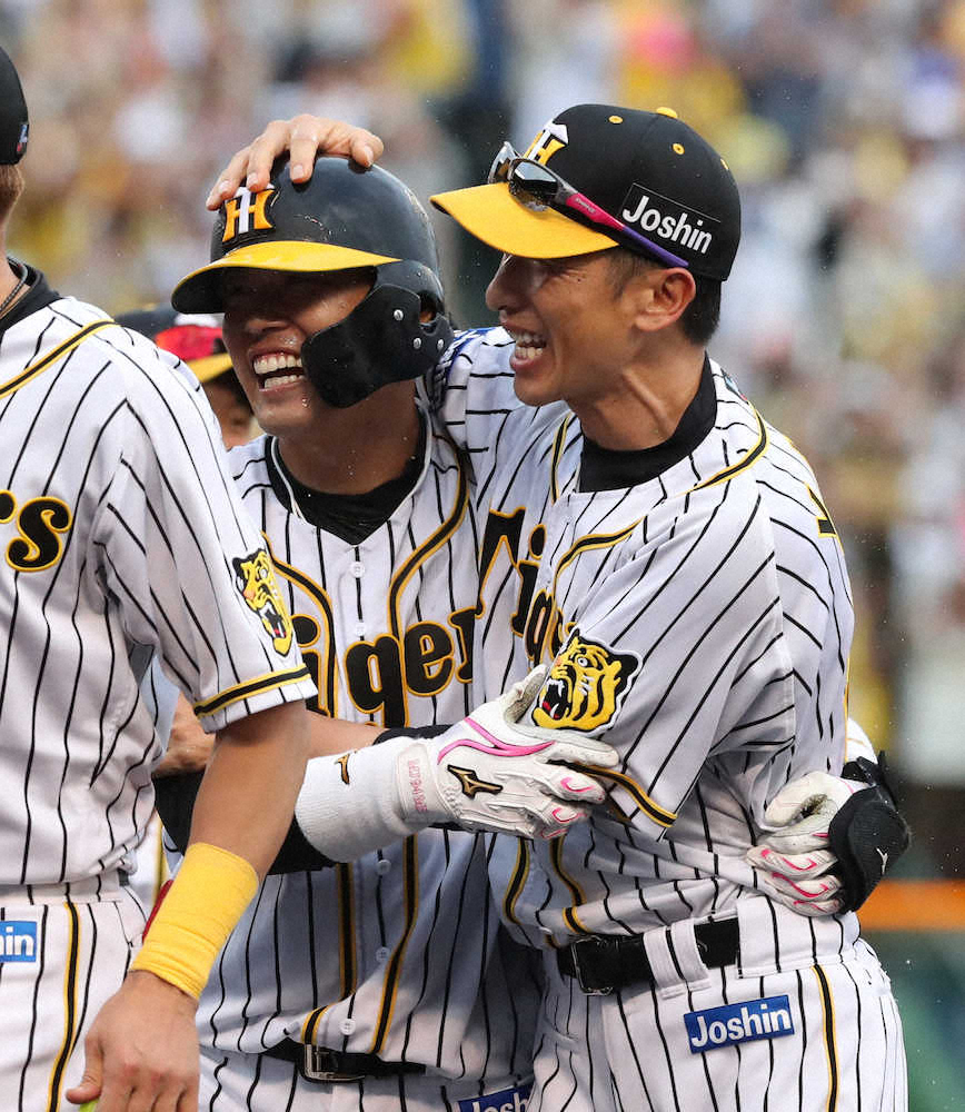 <神・日>9回、2死二、三塁、サヨナラ適時打を放った代打・原口(左)を矢野監督が祝福    (撮影・成瀬 徹)