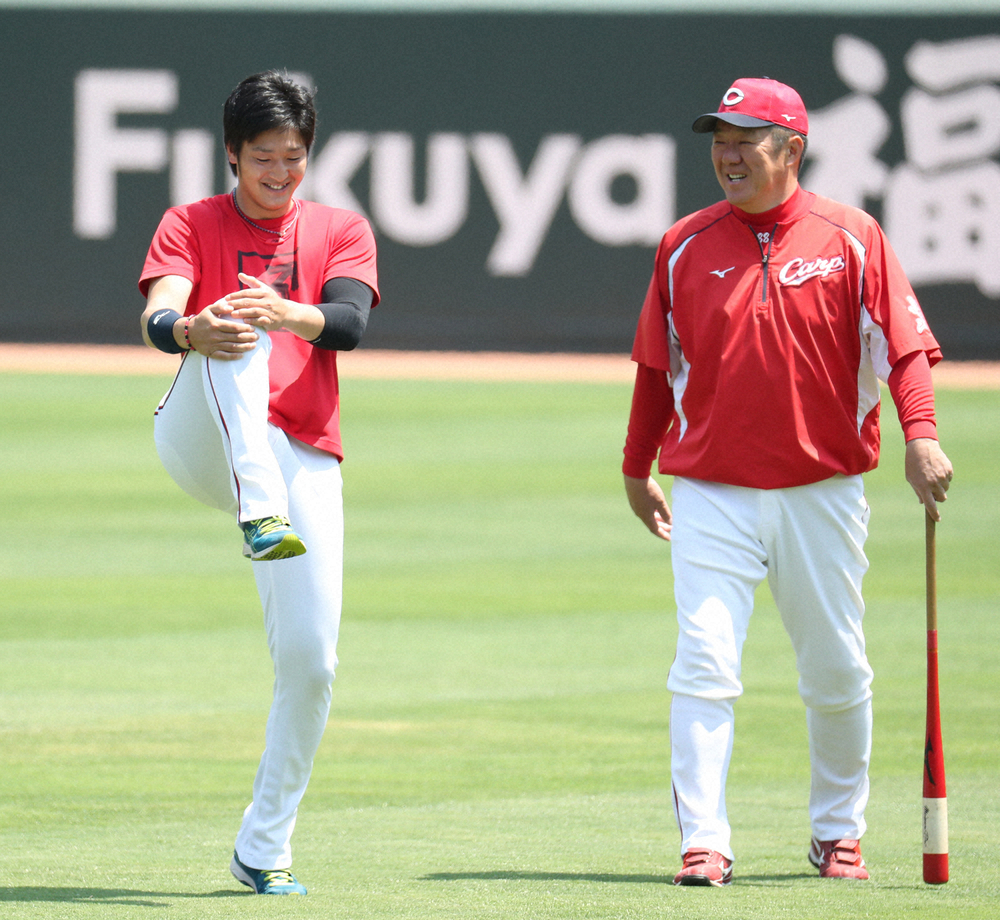 床田(左)に笑顔で話しかける佐々岡コーチ